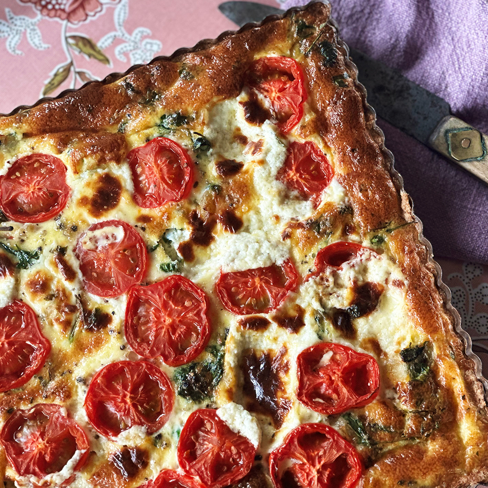 Sätt ugnen på 200°C. Börja med att göra pajdegen. Hacka ihop mjöl och smör till en grynig massa. Ner med kesellan och blanda till en slät deg. Tryck ut degen i en pajform med löstagbar kant. In med pajen i frysen i 20 minuter medan du pysslar vidare. Förgrädda pajen i 10 minuter. Under tiden sköljer du kirskål och nässlor, hacka dem fint. Fräs sedan lök och vitlök i smöret, när det blivit mjukt så ska även det gröna hacket ner i pannan. Krydda och smaka av lite. Blanda ägg och grädde i en skål och krydda lite där med. Ta ut pajskalet ur ugnen, grunda med det gröna och smula över getosten. Häll äggstanningen över det gröna och getosten, och lägg tomaterna ovanpå. In i ugnen i 45 minuter. Njut din paj med en fin grönsallad som tillbehör.